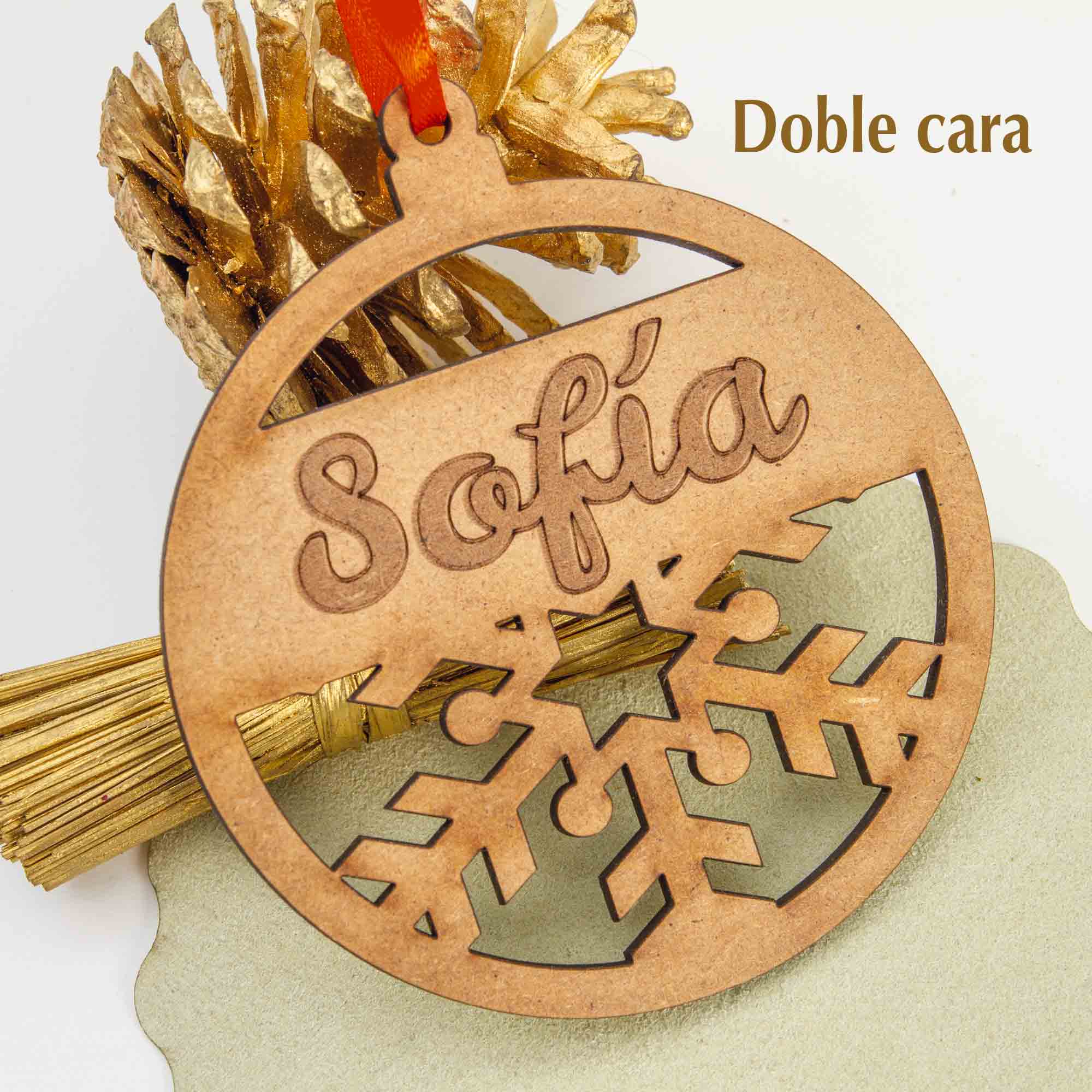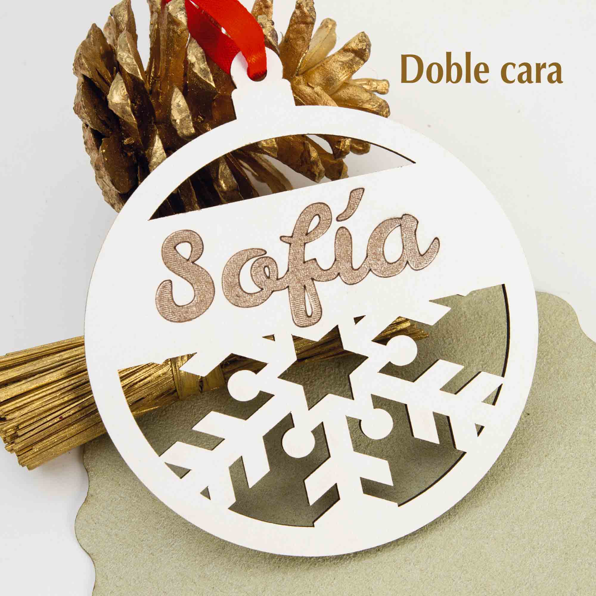 Una bola navideña en madera con un copo de nieve y el nombre personalizado. Bonita, ligera y muy navideña.