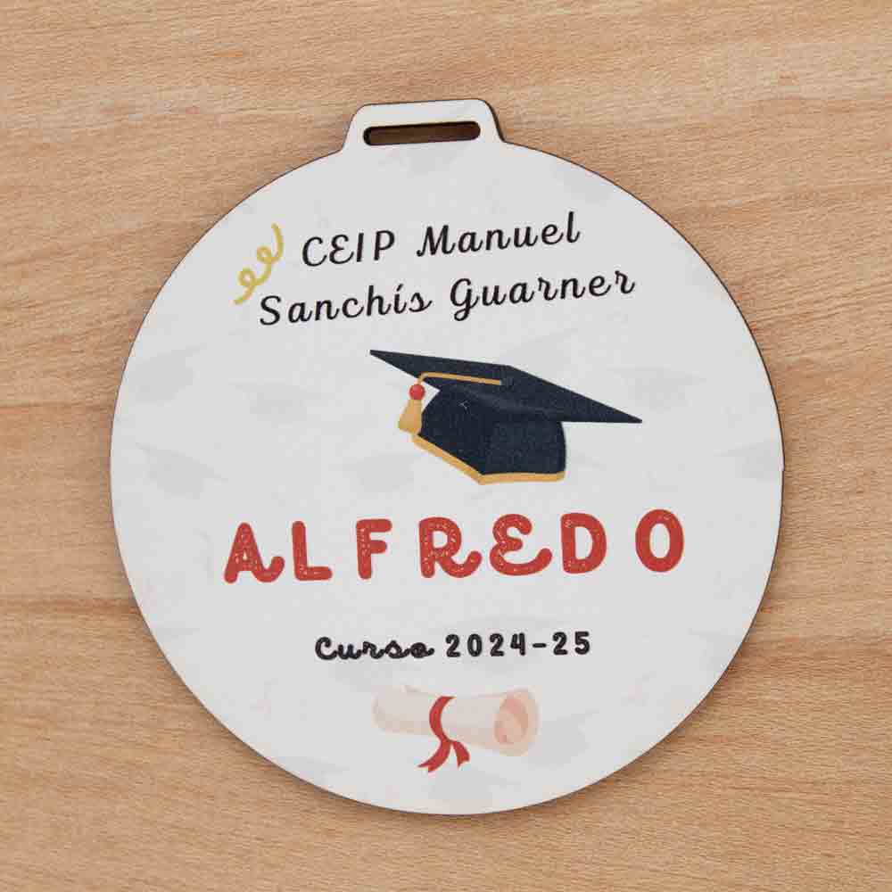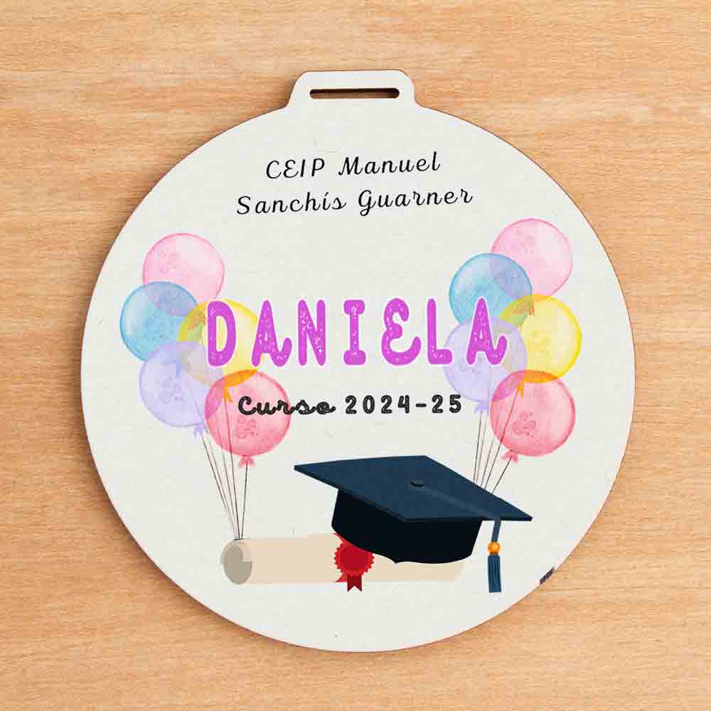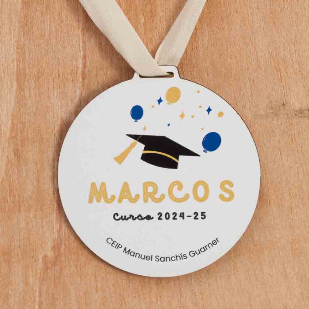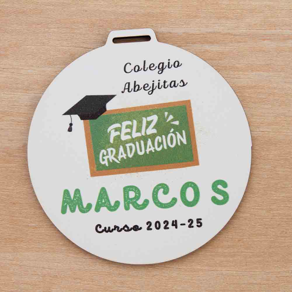 Cada medalla se personaliza con el nombre del niño o niña, el nombre del colegio y el curso, creando un recuerdo totalmente personalizado para la graduación.