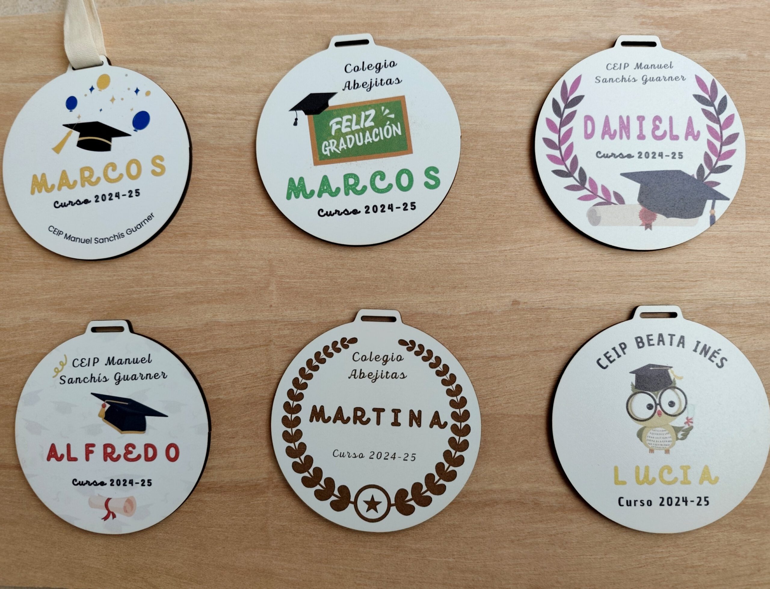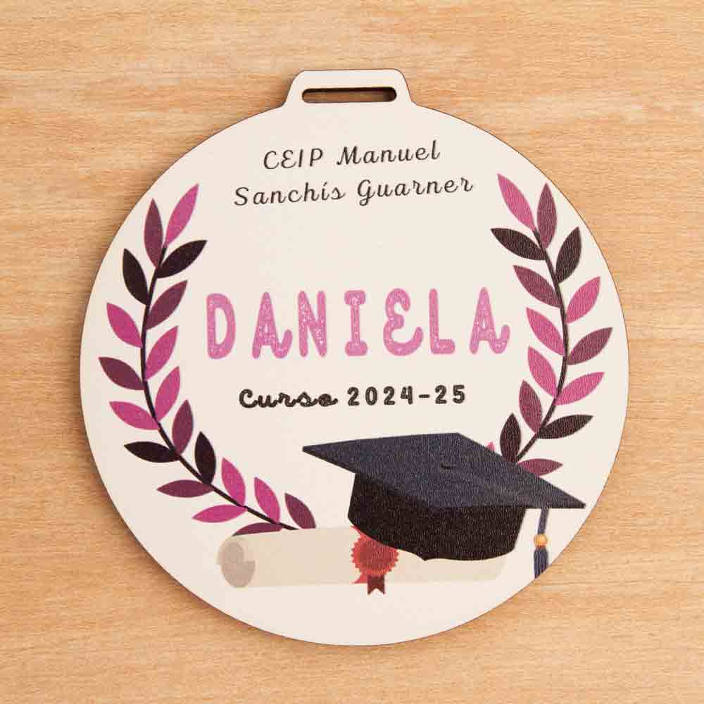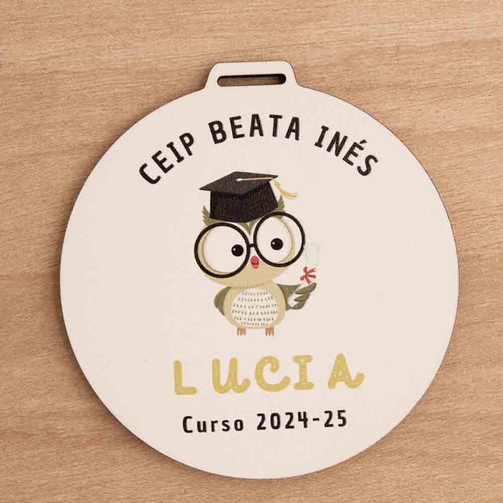 Cada medalla se personaliza con el nombre del niño o niña, el nombre del colegio y el curso, creando un recuerdo totalmente personalizado para la graduación.